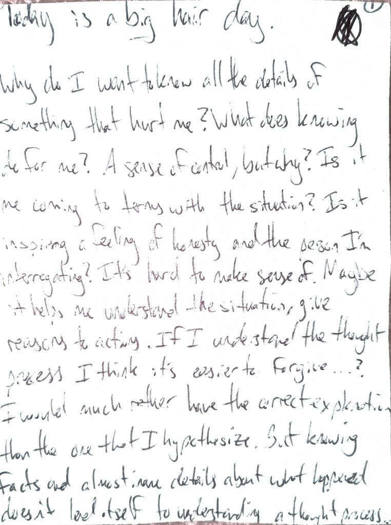 Why do I want to know all the details of something that hurt me? What does knowing do or me? A sense of control, but why? Is it me coming to terms with the situation? Is it inspiring a feeling of honesty and the person I’m interrogating? It’s hard to make sense of. Maybe it helps me understand the situation, give reasons to actions. If I understand the thought process I think it’s easier to forgive… ? I would much rather have the correct explanation than the one that I hypothesize. But knowing facts and almost inane details about what happened doesn’t lend itself to understanding a thought process.