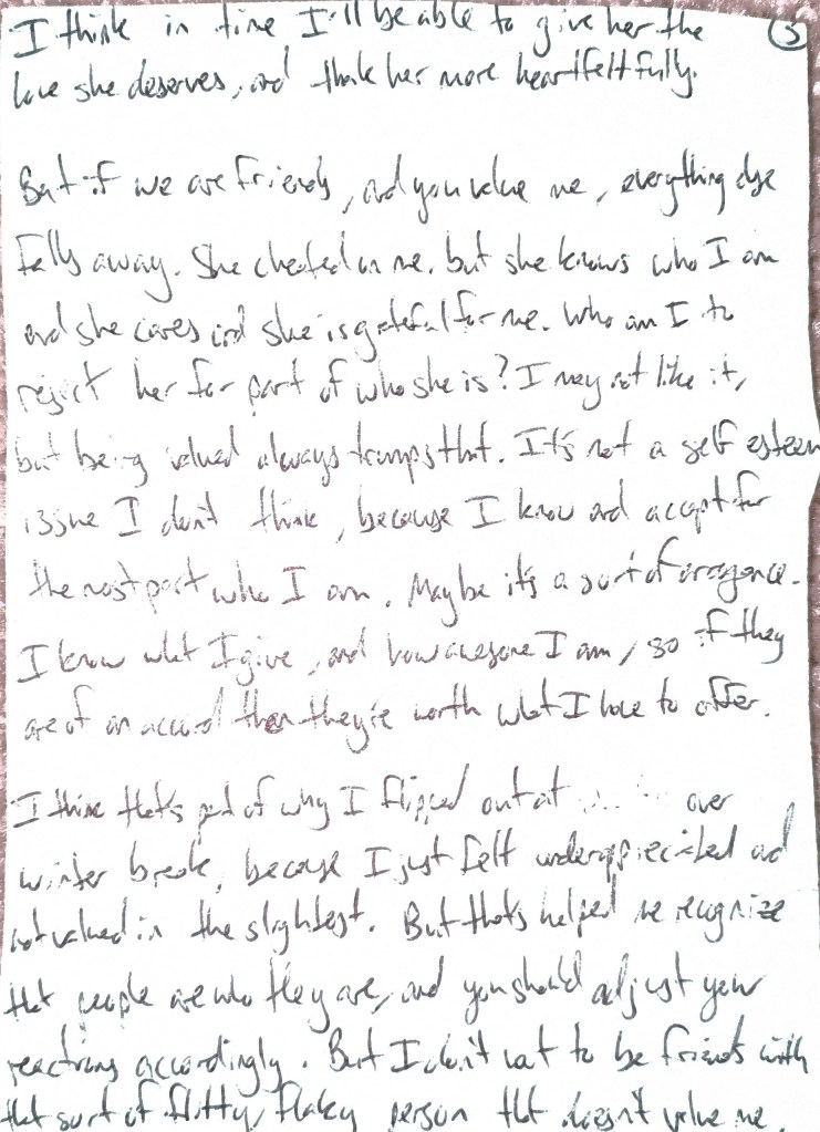 I think that’s part of why I flipped out at [close female high school friend] over winter break, because I just felt underappreciated and not valued in the slightest. But that’s helped me recognize that people are who they are, and you should adjust your reactions accordingly. But I don’t want to be friends with that sort of flitty, flaky person that doesn’t value me.