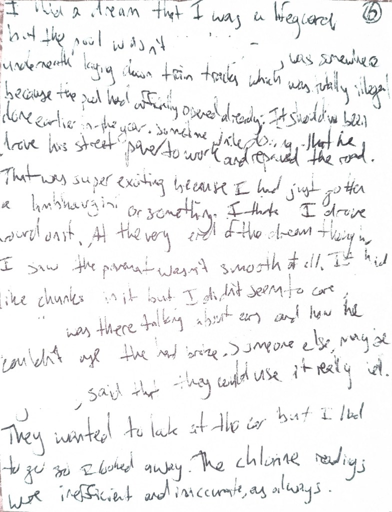 I had a dream that I was a lifeguard, but the pool wasn’t [teenhood pool]. [Pool boss/handy man] was somewhere underneath laying down train tracks which was totally illegal because the pool had officially opened already. It should have been done earlier in the year. Sometime while doing that he drove his street paver to work and repaved the road. That was super exciting because I had just gotten a lambhourgini or something. I think I drove around on it. At the very end of the dream though, I saw the pavement wasn’t smooth at all. It had like chunks in it but I didn’t seem to care. [High school/pool friend] was there talking about cars and how he couldn’t use the hand brake. Someone else, maybe [high school acquaintance/friend], said that they could use it really well. They wanted to look at the car but I had to go so I looked away. The chlorine readings were inefficient and inaccurate, as always.