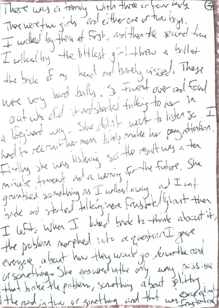 There was a family with three or four kids. There were two girls and either one or two boys. I walked by them at first, and then the second time I walked by the littlest girl threw a ball at the back of my head and barely missed. These were very hard balls. So I went over and found out who did it and started talking to her in a lifeguard way. She didn’t want to listen so I had to recruit her mom to help make her pay attention. Finally she was listening so the result was a ten minute timeout and a warning for the future. She grumbled something as I walked away and I went back and started talking more frustratedly but then I left. When I looked back to think about it, the problem morphed into a question I gave everyone about how they would go down the road or something. She answered in the only way possible that broke the problem, something about splitting the road in two or something and that was exceedingly frustrating.