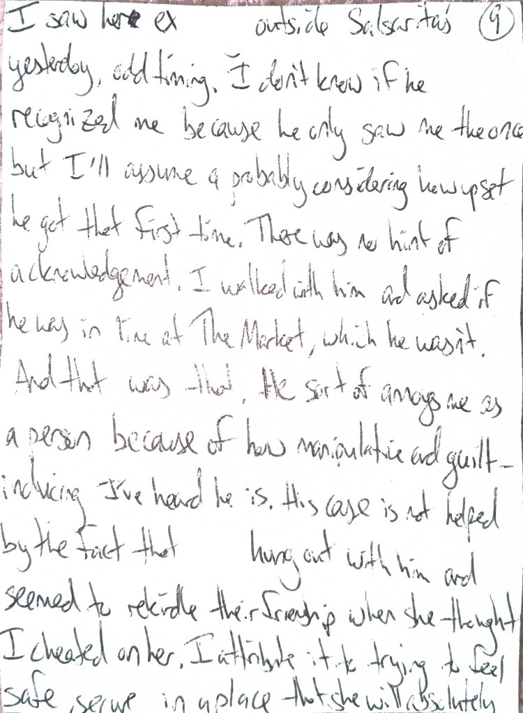 I saw her ex [name] outside Salsarita’s yesterday, odd timing. I don’t know if he recognized me because he only saw me the once but I’ll assume a probably considering how upset he got that first time. There was no hint of acknowledgment. I walked with him and asked if he was in line at The Market, which he wasn’t.