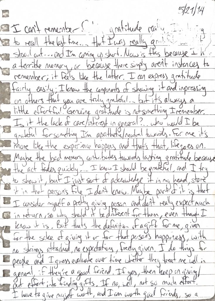 I can’t remember feeling gratitude really. I’m trying to recall the last time… that I was really grateful where it stood out… and I’m coming up short. Now is this because I have a terrible memory, or because there simply aren’t instances to remember; it feels like the latter. I can express gratitude fairly easily; I know the components of showing it and impressing on others that you are truly grateful… but it’s always a little effortful. Genuine gratitude is not something I remember. Is it the lack of care/interest in general?.. why would I be grateful for something I’m apathetic/neutral towards. For me it’s more like the experience happens and that’s that, life goes on. Maybe the bad memory contributes towards lasting gratitude because the act fades quickly… I know I should be grateful, and I try to show it, but I just sort of acknowledge it in my head, store it in that person’s file, I don’t know. Maybe part of it is that I consider myself a pretty giving person and don’t really expect much in return, so why should it be different for them, even though I know it is. But that’s the definition of a gift for me, given for the sake of giving it or for that person’s happiness, with not strings attached, no expectations, freely given. I do things for people and I guess evaluate over time whether they treat me well in general, whether they’re a good friend. If yes, then keep on giving/put effort into finding gifts. If no, well, not so much effort. I have to give myself worth, and I am worth good friends, so a