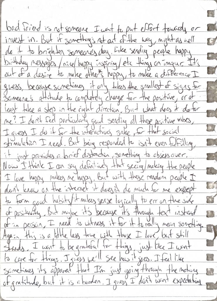 bad friend is not someone I want to put effort towards or invest in. But if something’s not out of the way, might as well do it to brighten someone’s day. Like sending people happy birthday messages/nice/happy inspiring/etc on imgur. It’s out of a desire to make others happy, to make a difference I guess, because sometimes it only takes the smallest of signs for someone’s attitude to completely change for the positive, or at least take a step in the right direction. But what does it do for me? I don’t feel particularly good sending all those positive vibes, I guess I do it for the interaction’s sake, for that social stimulation I need. But being responded to isn’t even fulfilling, it just provides a brief distraction, something to obsess over. Now I think I can say definitively that seeing/making the people I love happy makes me happy. But with these random people I don’t know on the internet it doesn’t do much for me except to form good habits/it makes sense logically to err on the side of positivity. But maybe it’s because it’s through text instead of in person, I need to witness it for it to really mean something. Again, this is a little less true with those I love, but still stands. I want to be grateful for things, just like I want to care for things. I guess we’ll see how it goes. I feel like sometimes it’s apparent that I’m just going through the motions of gratitude, but it is a burden. I guess I don’t want expectations.