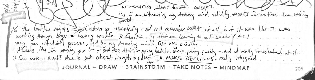 the last two nights I have woken up repeatedly – and can’t remember WHAT at all but it was like I was working through anger or feeling unsafe. or memories almost, or trauma, concepts. like I am witnessing my dreaming mind solidify concepts for me from the waking world.