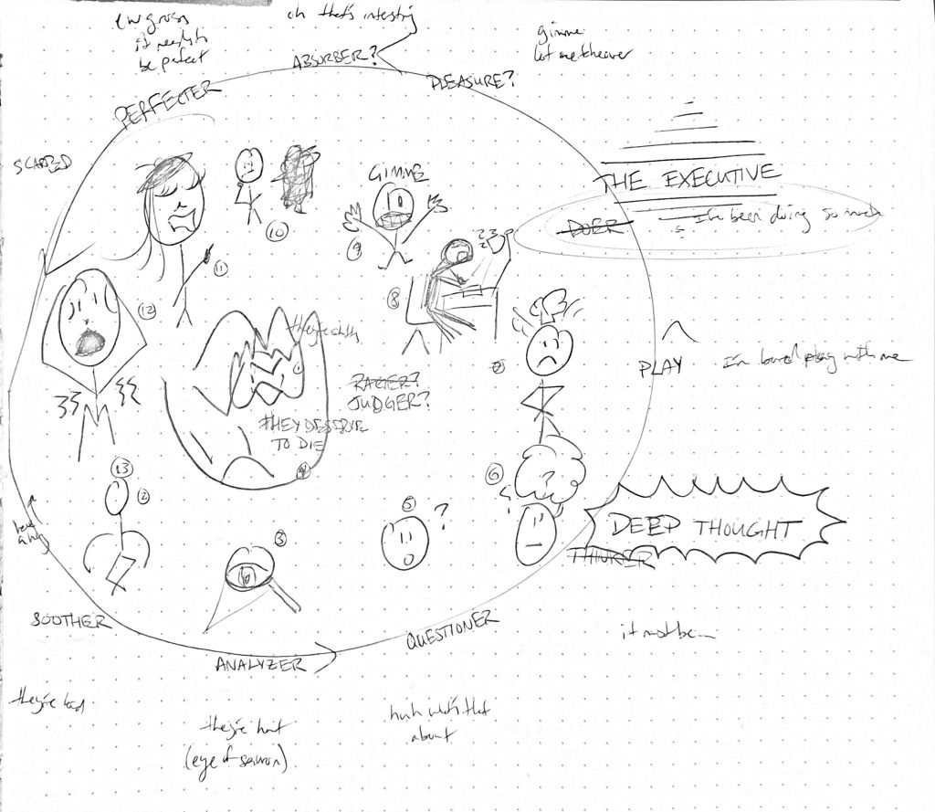THINKERDEEP THOUGHT – thinky face with thinky cloud – it must be…- PLAY – grumpy child-being – I’m bored play with me