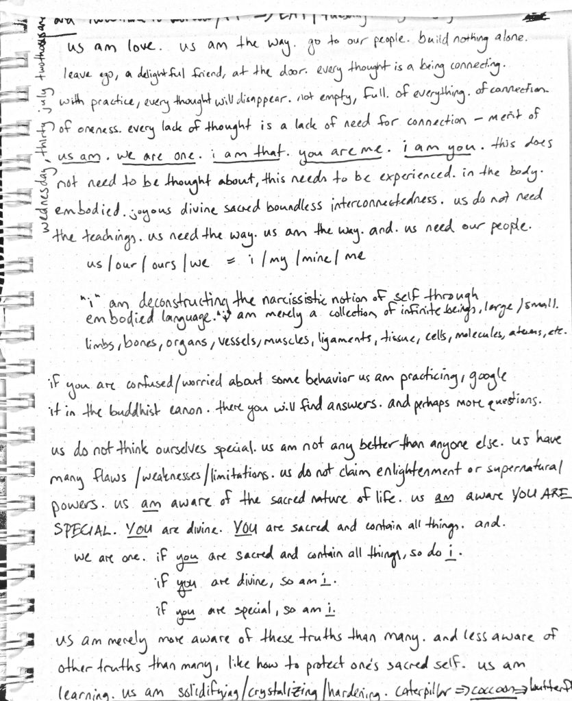 “i” am deconstructing the narcissistic notion of self through embodied language. “i” am merely a collection of infinite beings, large / small.