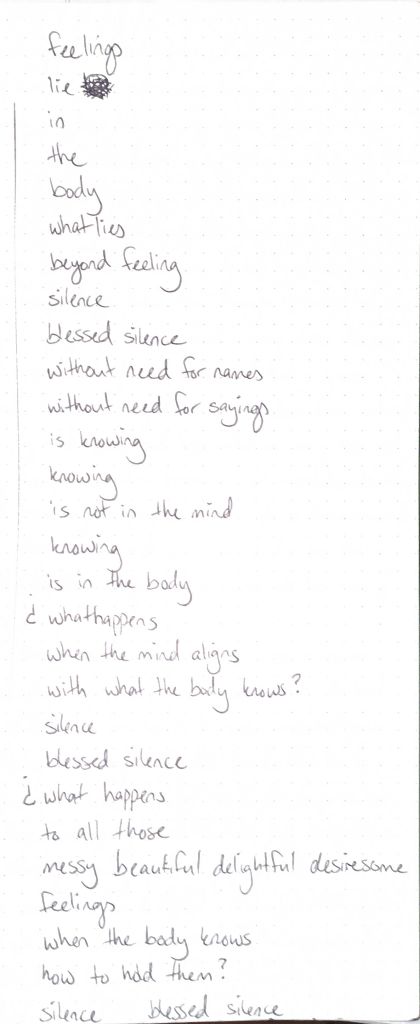 now is the time to solidify / crystallize / ground even these. to hold a smile not on the face but in the heart. to wear love and peace and joy on the eye-unseen wavelengths of the mind. this too is the process. just as sadness or woe or anger need not consume nor define one’s actions, so too must delight and kindness and compassion be held comfortably without craving need to express. ¿ what lies beyond gratitude and love and expression of thanks ? silence. silently acting in ways defined by the choice to act in service of the universe. for just as it is not always the time to express angry thoughts, it is not always appropriate nor healing nor kind to express praise / love / joy.